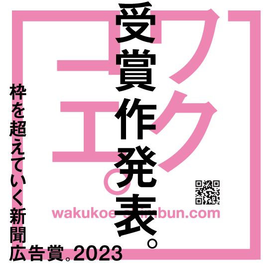 審査に参加させていただき感じたことは最終的に選ばれた作品は、1人1人審査員の視点は異なるので多角的な視点に最後まで耐えることができた作品だということです。そこに至る受賞者のテーマをあらゆる角度から照らし強固にしながら作品として昇華する日々に頭が下がる思いです、心よりおめでとうございます。また、「ワクコエ」という新聞広告賞には枠を超えるという課題もあります。応募者がどうやって枠を超えるのか、そもそも枠とは何なのかといった根源的な問いにも果敢に迫る作品に出会えたこと、世代が違った素敵な審査員の方々と議論できた濃密な時間は喜びの連続でした。